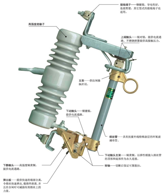 RW7跌落式熔斷器及拉負荷跌落式熔斷器是戶外高壓保護電器。它裝置在配電變壓器高壓側(cè)或配電線支干線路上、用作變壓器和線路的短路、過載保護及分、合負荷電流。跌落式熔斷器由絕緣支架和熔絲管二部分組成,靜觸頭安裝在絕緣支架兩端,動觸頭安裝在熔絲管兩端,熔絲管由內(nèi)層的消弧管和外層的酚醛紙管或環(huán)氧玻璃布管組成。拉負荷跌落式熔斷器增強彈性輔助觸頭及滅弧罩,用以分,合負荷電流。
