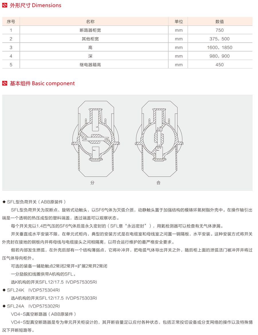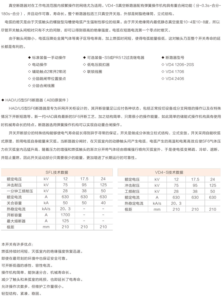 環(huán)網(wǎng)柜的主開關(guān)、操作機(jī)構(gòu)及元器件采用ABB公司原裝件或采用進(jìn)口部件國內(nèi)組裝生產(chǎn)的SFL-12/24型開關(guān)設(shè)備,也可根據(jù)用戶需要配裝ABB公司原裝HAD/US型SF6。斷路器或VD4-S型真空斷路器。其操作方式分為手動、電動兩種。